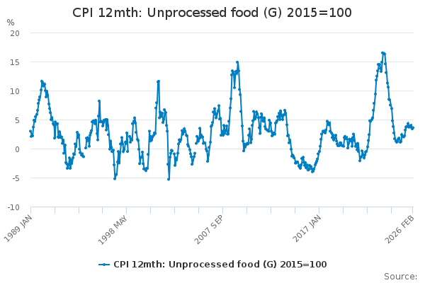 Download this time seriesCPI 12mth: Unprocessed food (G) 2015=100