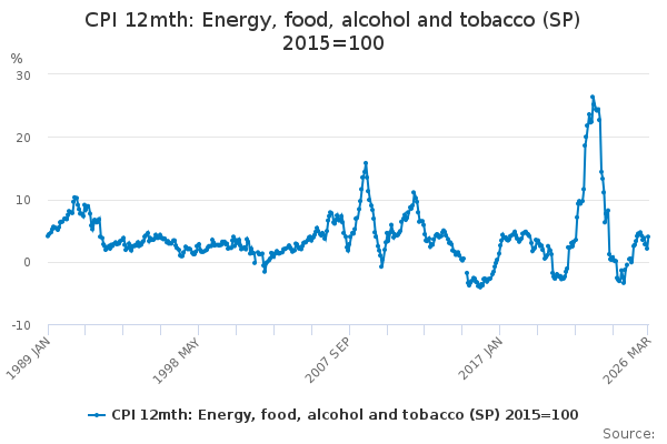 Download this time seriesCPI 12mth: Energy, food, alcohol and tobacco (SP) 2015=100
