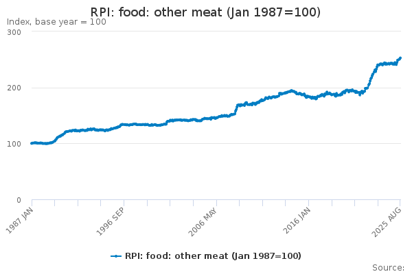 Download this time seriesRPI: food: other meat (Jan 1987=100)