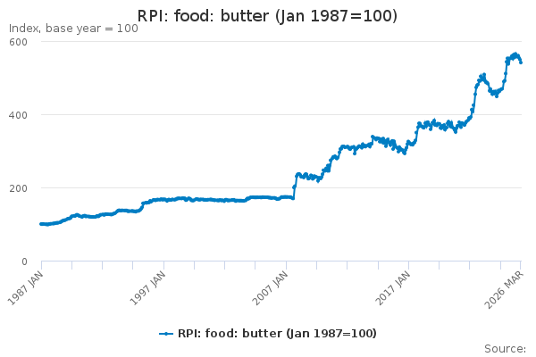 Download this time seriesRPI: food: butter (Jan 1987=100)