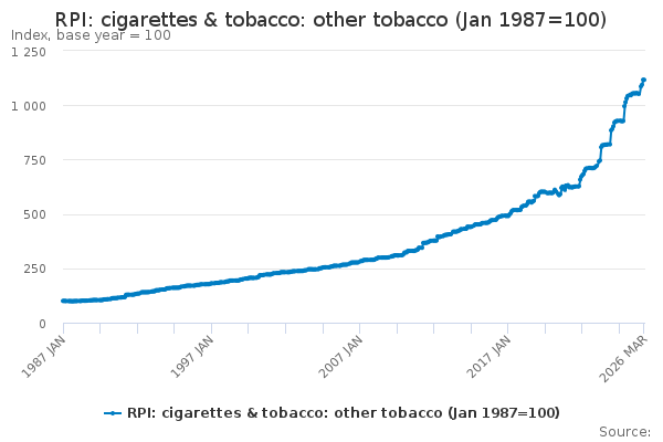 Download this time seriesRPI: cigarettes & tobacco: other tobacco (Jan 1987=100)