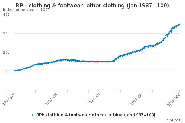 Download this time seriesRPI: clothing & footwear: other clothing (Jan 1987=100)