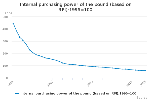 Download this time seriesInternal purchasing power of the pound (based on RPI):1996=100