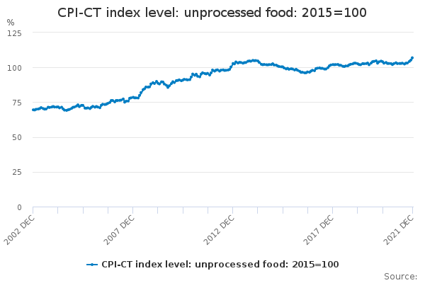 Download this time seriesCPI-CT index level: unprocessed food: 2015=100