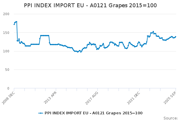 Download this time seriesPPI INDEX IMPORT EU - A0121 Grapes 2015=100