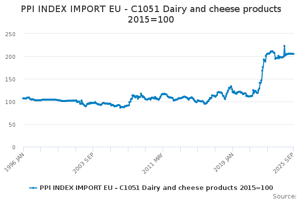 Download this time seriesPPI INDEX IMPORT EU - C1051 Dairy and cheese products 2015=100
