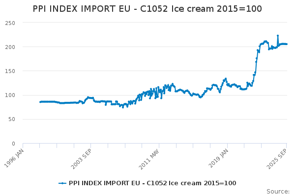 Download this time seriesPPI INDEX IMPORT EU - C1052 Ice cream 2015=100