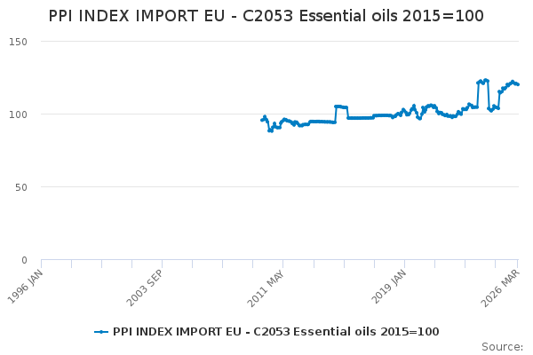 Download this time seriesPPI INDEX IMPORT EU - C2053 Essential oils 2015=100
