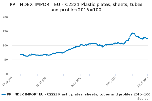 Download this time seriesPPI INDEX IMPORT EU - C2221 Plastic plates, sheets, tubes and profiles 2015=100