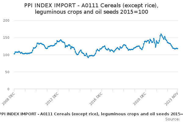 Download this time seriesPPI INDEX IMPORT - A0111 Cereals (except rice), leguminous crops and oil seeds 2015=100