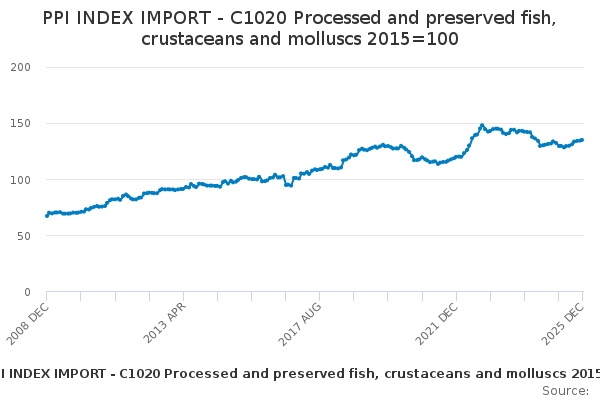 Download this time seriesPPI INDEX IMPORT - C1020 Processed and preserved fish, crustaceans and molluscs 2015=100