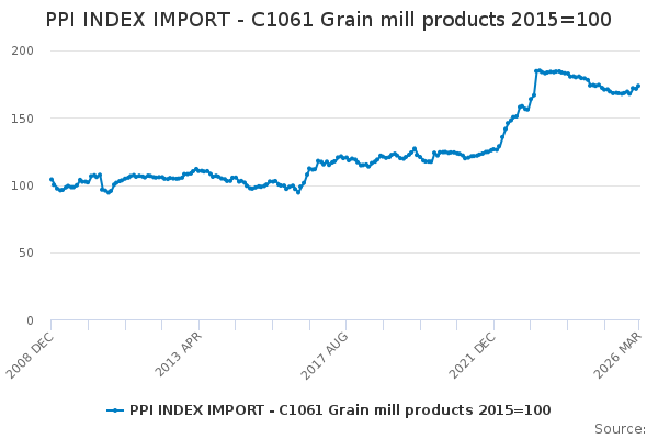 Download this time seriesPPI INDEX IMPORT - C1061 Grain mill products 2015=100