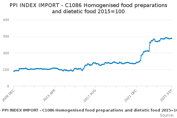 Download this time seriesPPI INDEX IMPORT - C1086 Homogenised food preparations and dietetic food 2015=100