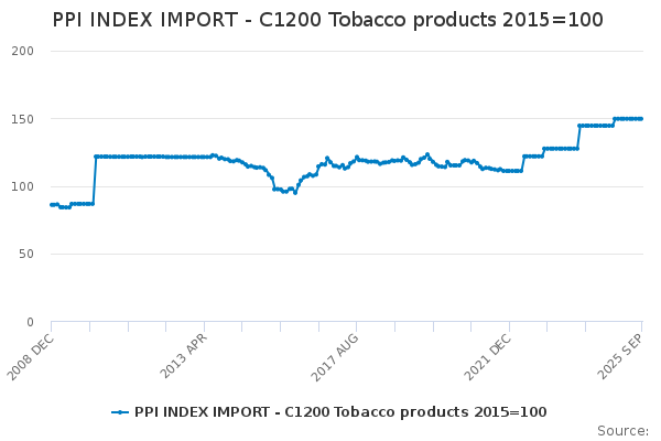 Download this time seriesPPI INDEX IMPORT - C1200 Tobacco products 2015=100