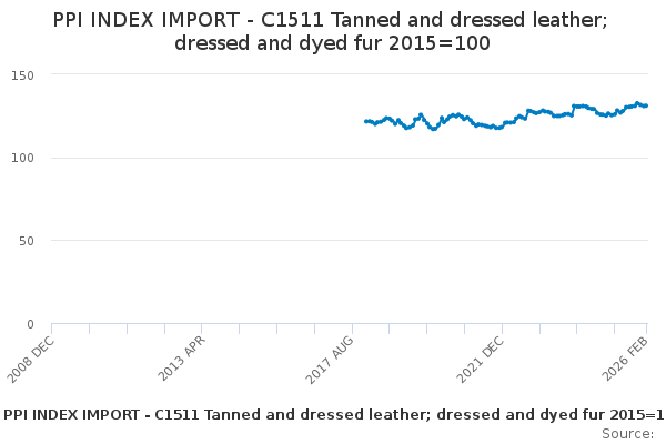 Download this time seriesPPI INDEX IMPORT - C1511 Tanned and dressed leather; dressed and dyed fur 2015=100