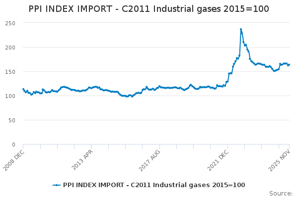 Download this time seriesPPI INDEX IMPORT - C2011 Industrial gases 2015=100