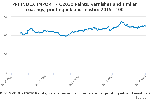 Download this time seriesPPI INDEX IMPORT - C2030 Paints, varnishes and similar coatings, printing ink and mastics 2015=100