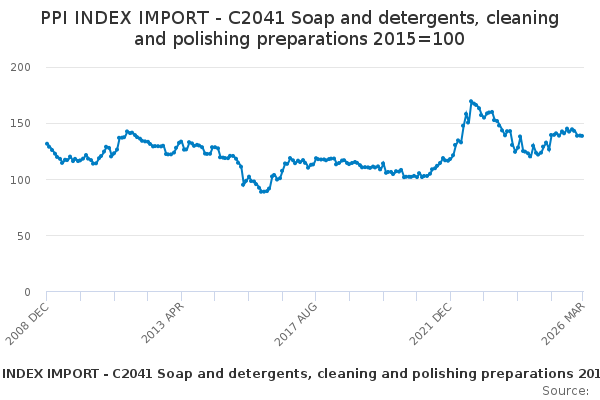 Download this time seriesPPI INDEX IMPORT - C2041 Soap and detergents, cleaning and polishing preparations 2015=100