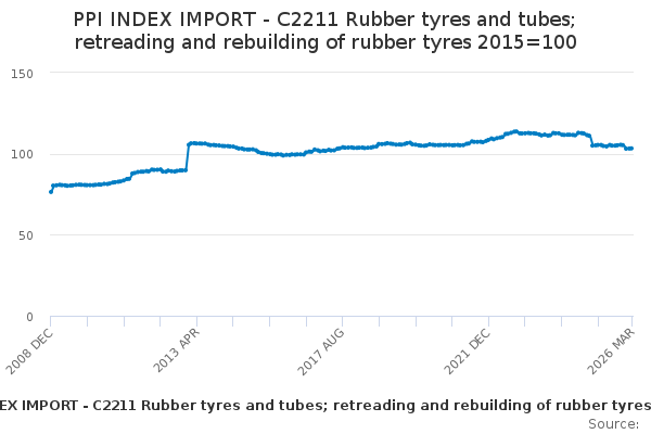 Download this time seriesPPI INDEX IMPORT - C2211 Rubber tyres and tubes; retreading and rebuilding of rubber tyres 2015=100
