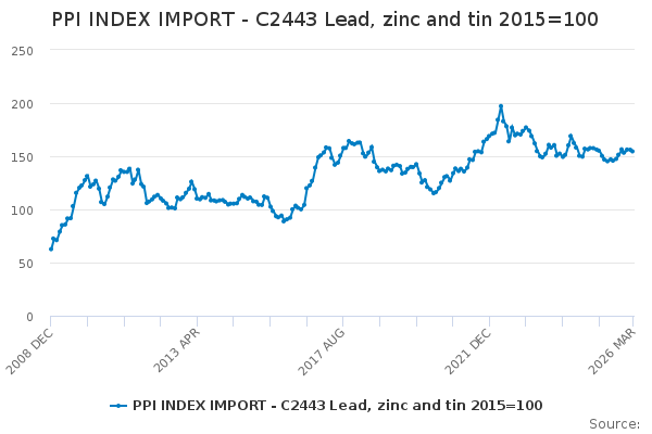 Download this time seriesPPI INDEX IMPORT - C2443 Lead, zinc and tin 2015=100