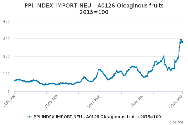Download this time seriesPPI INDEX IMPORT NEU - A0126 Oleaginous fruits 2015=100