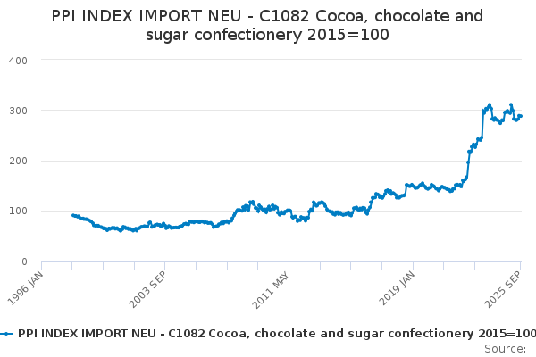 Download this time seriesPPI INDEX IMPORT NEU - C1082 Cocoa, chocolate and sugar confectionery 2015=100