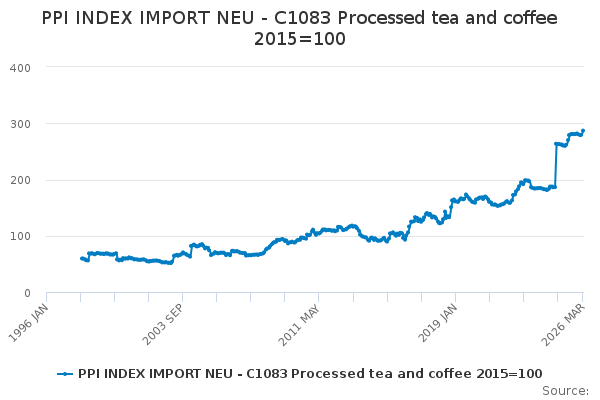 Download this time seriesPPI INDEX IMPORT NEU - C1083 Processed tea and coffee 2015=100