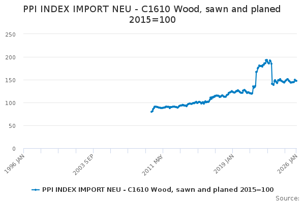 Download this time seriesPPI INDEX IMPORT NEU - C1610 Wood, sawn and planed 2015=100