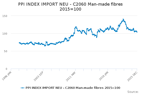 Download this time seriesPPI INDEX IMPORT NEU - C2060 Man-made fibres 2015=100