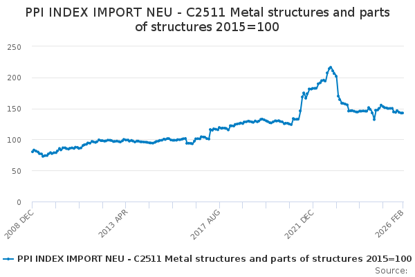 Download this time seriesPPI INDEX IMPORT NEU - C2511 Metal structures and parts of structures 2015=100