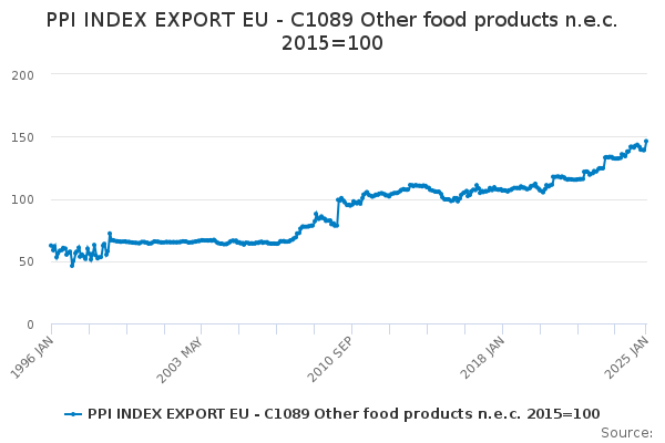 Download this time seriesPPI INDEX EXPORT EU - C1089 Other food products n.e.c. 2015=100