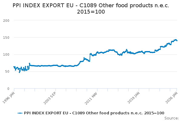Download this time seriesPPI INDEX EXPORT EU - C1089 Other food products n.e.c. 2015=100