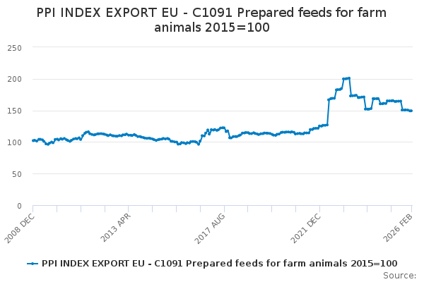 Download this time seriesPPI INDEX EXPORT EU - C1091 Prepared feeds for farm animals 2015=100