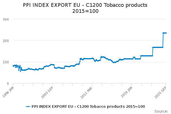 Download this time seriesPPI INDEX EXPORT EU - C1200 Tobacco products 2015=100