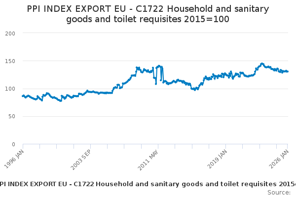 Download this time seriesPPI INDEX EXPORT EU - C1722 Household and sanitary goods and toilet requisites 2015=100