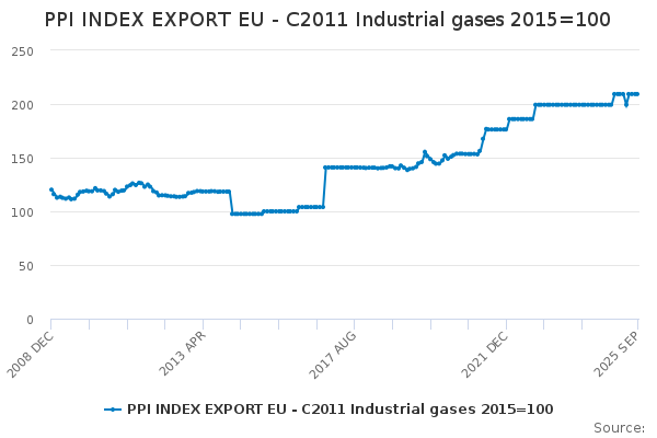 Download this time seriesPPI INDEX EXPORT EU - C2011 Industrial gases 2015=100
