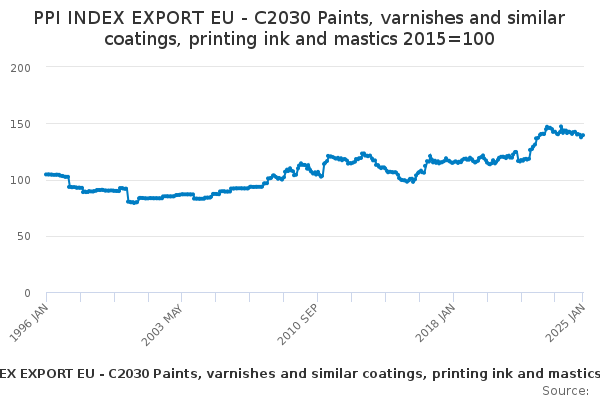 Download this time seriesPPI INDEX EXPORT EU - C2030 Paints, varnishes and similar coatings, printing ink and mastics 2015=100