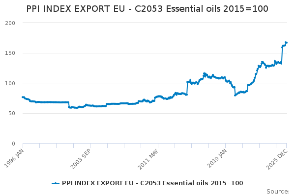 Download this time seriesPPI INDEX EXPORT EU - C2053 Essential oils 2015=100
