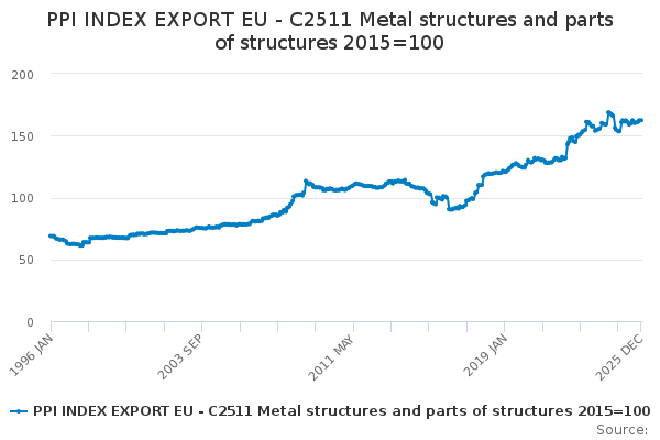 Download this time seriesPPI INDEX EXPORT EU - C2511 Metal structures and parts of structures 2015=100