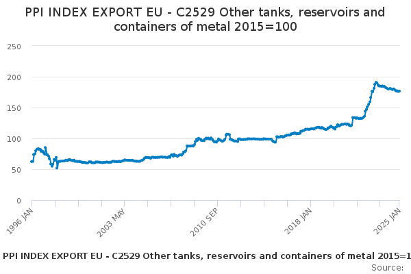 Download this time seriesPPI INDEX EXPORT EU - C2529 Other tanks, reservoirs and containers of metal 2015=100