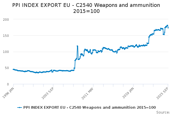 Download this time seriesPPI INDEX EXPORT EU - C2540 Weapons and ammunition 2015=100