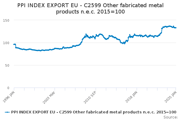 Download this time seriesPPI INDEX EXPORT EU - C2599 Other fabricated metal products n.e.c. 2015=100