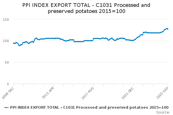 Download this time seriesPPI INDEX EXPORT TOTAL - C1031 Processed and preserved potatoes 2015=100