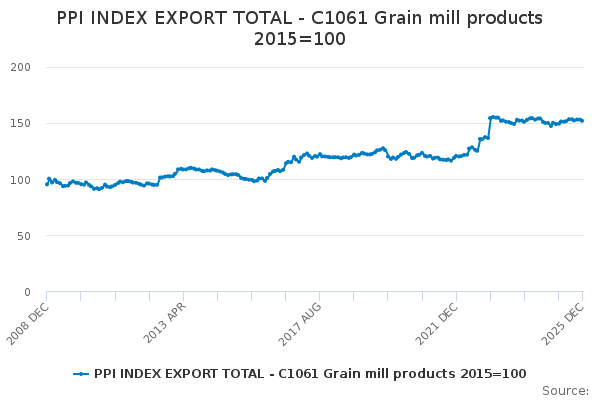 Download this time seriesPPI INDEX EXPORT TOTAL - C1061 Grain mill products 2015=100