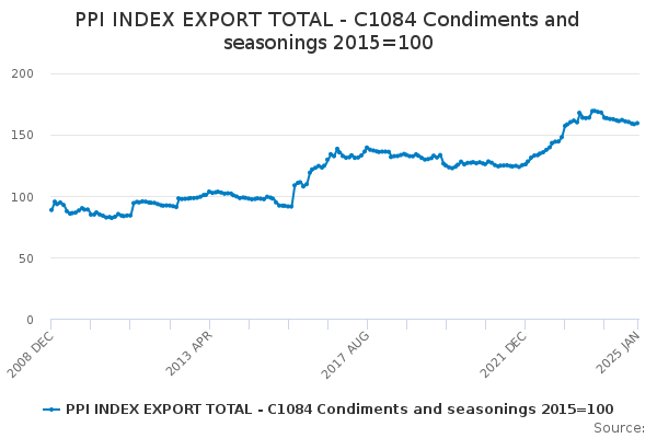 Download this time seriesPPI INDEX EXPORT TOTAL - C1084 Condiments and seasonings 2015=100