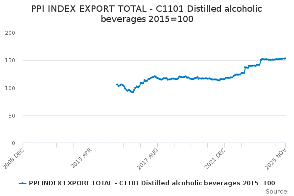 Download this time seriesPPI INDEX EXPORT TOTAL - C1101 Distilled alcoholic beverages 2015=100