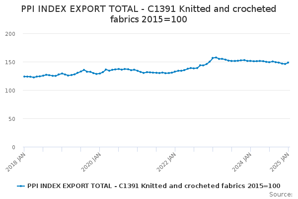 Download this time seriesPPI INDEX EXPORT TOTAL - C1391 Knitted and crocheted fabrics 2015=100