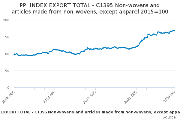 Download this time seriesPPI INDEX EXPORT TOTAL - C1395 Non-wovens and articles made from non-wovens, except apparel 2015=100
