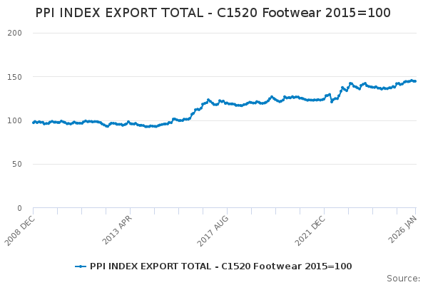 Download this time seriesPPI INDEX EXPORT TOTAL - C1520 Footwear 2015=100