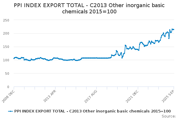 Download this time seriesPPI INDEX EXPORT TOTAL - C2013 Other inorganic basic chemicals 2015=100